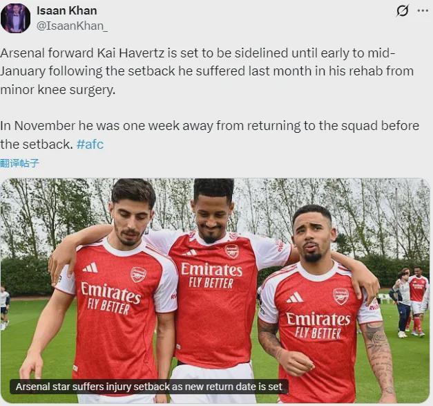 至于哈弗茨,上面邮报的IK说他可能1月中上旬才复出,但阿尔特塔这里又是非常乐观,说“很快”就能归队,咱们关键是不清楚他这个很快是多快,毕竟1月上旬的话,也就2周多时间……好在热苏斯复出了,而且看起来状态不错,哈弗茨暂时没有这么紧迫。